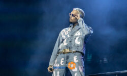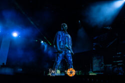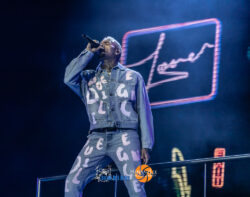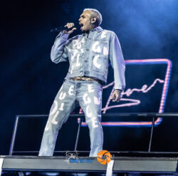 Chris Brown performs to a sold-out crowd. He comes down ascending from the ceiling hanging from two wires with the spotlight shining down on him and the big screen displays a picture of people hanging in the air. He is wearing pink sunglasses a blue jean jacket with white letters on it along with matching jeans. Chris Brown does a remarkable job at extensive choreography. He is a phenomenal performer and knows how to work the crowd.